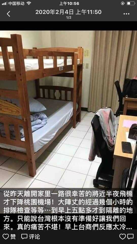 有名陳姓網友6日在臉書發文爆料,某位返台後被隔離的台商,一下嫌飯菜不夠好,一下嫌棉被不夠暖,「然後宣傳對象還是對面五毛小粉紅,真的敬佩他們,死到臨頭都還不忘祖國交代的,維穩貶台之大業。不然回台過太爽,中國民眾可是會暴動的」。
