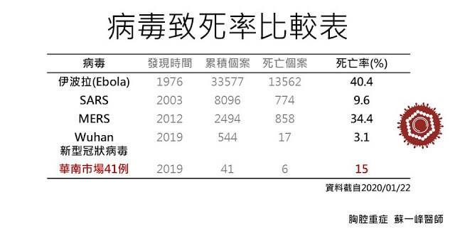 在第一例死亡個案出現之前,認為武漢肺炎的致死率是低於SARS和MERS,傳染途徑仍不明,目前仍然沒有有效的治療方式。