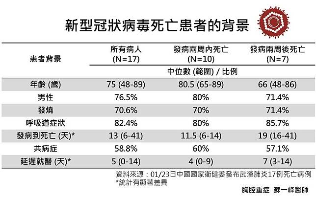 此外,根據中國國家衛健委23日發布武漢肺炎17例死亡病例的病情,進一步分析發現: