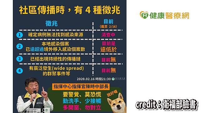 【健康醫療網/記者蔡岳宏報導】台灣中央流行疫情指揮中心16日公布2例COVID-19(武漢肺炎)個案,兩例都無旅遊史,台灣算出現社區傳播嗎?衛福部長陳時中強調,社區傳播定義是「在社區走動就有感染的風險」,且須滿足4徵兆中的3項都不符合,只有感染源還在調查中,社區傳播風險仍然很低,呼籲民眾維持目前口罩配戴建議、勤洗手,不須恐慌。