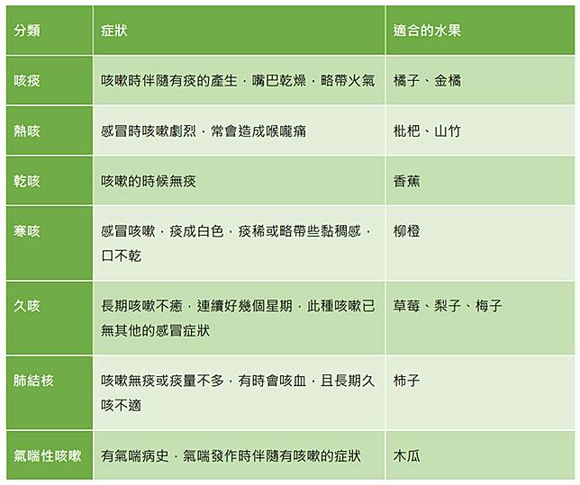 由於每個人的咳嗽症狀不盡相同,有寒咳、熱、乾咳、久咳等。因此每一種咳嗽所適合的水果就有所區別。食用適當的水果,會適時緩解咳嗽症狀。茲將各種咳嗽的症狀與適合的水果整理如下,以供讀者做參考: