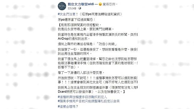 臉書粉專「數位女力聯盟widi」昨天(5日)分享了這名女網友的經歷,原PO事發當時從捷運永安市場站上車,要到東門站轉車,她坐在車廂內滑手機關心疫情相關新聞時,突然有個AirDrop的通知跳出來,上頭顯示的傳送名稱是「防疫小知識」,原本猶豫了1秒,原PO最後還是決定點開來看。