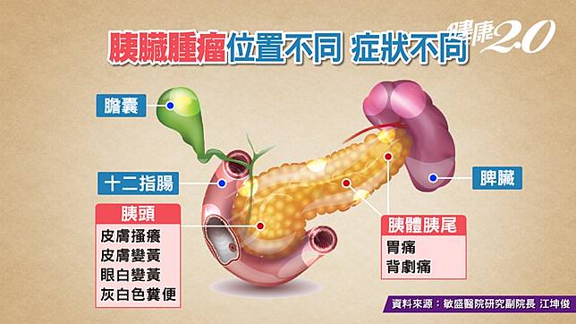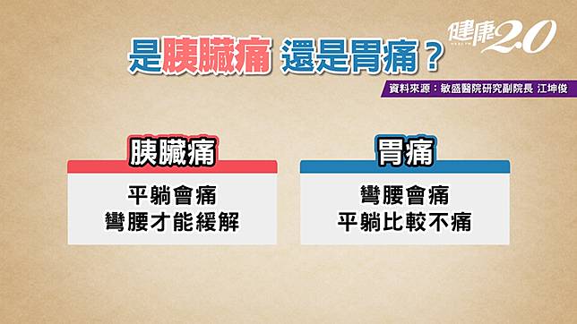敏盛醫院研究副院長江坤俊指出,胰臟有2個功能,一是分泌胰島素,一是分泌消化酵素。每當食物吃進來時,除了胰臟會分泌消化酵素,胃也會分泌,因此,吃完東西後出現上腹痛,到底是胰臟痛還是胃痛,常讓人搞不清楚。
