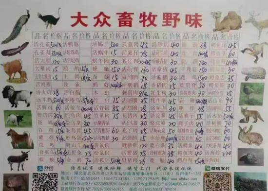 後來關於病毒的溯源,都指向了華南海鮮市場裏售賣的野生動物。網路上流傳出的圖片顯示,一家「大眾畜牧」的攤位售賣的野味種類多達42種,包括竹鼠、狗貍獾、豬貍獾、果子貍、狐貍、樹熊、孔雀、大雁等。