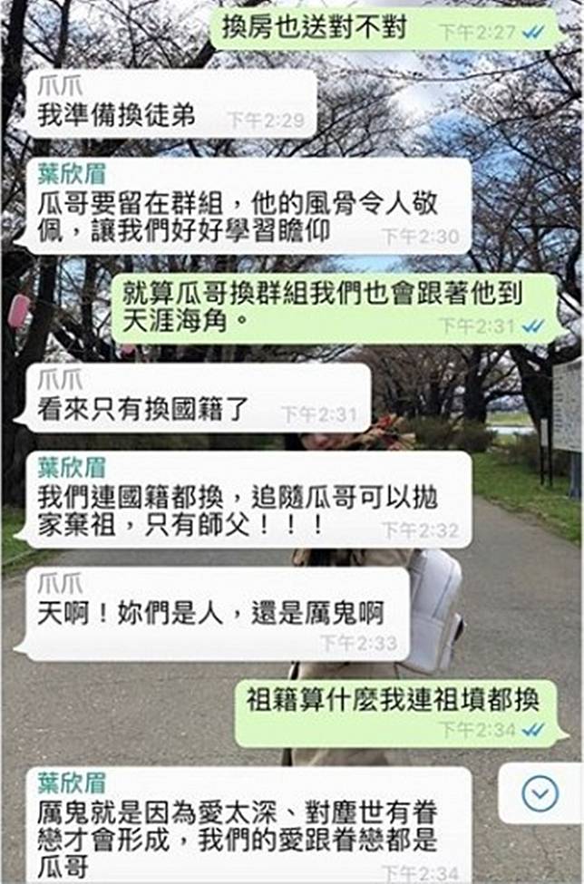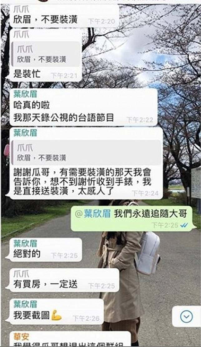 謝忻在個人IG分享「師徒群組」的對話,這個群組裡面,包含她、暱稱「爪爪」的胡瓜、還有瑪莉亞(葉欣眉)及助理華安。對話一開是,本來胡瓜是想叫瑪莉亞「不要裝忙」,卻錯打成「不要裝潢」,瑪莉亞順勢回應:「謝謝瓜哥,有需要裝潢的那天,我會告訴你,想不到謝忻收到手錶,我是直接送裝潢,太感人了。」謝忻也馬上巴結胡瓜:「我們永遠追隨大哥」。