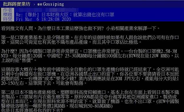 文章被分享後,不少網友困惑,日本是先進大國,為什麼無法做到建置、加開口罩生產線?隨即有網友發表長文解釋,指出口罩產業,對於世界各國來說是屬於夕陽產業;加上大陸製作口罩成本很低廉,口罩機也很便宜,亞洲地區大概只剩中國大陸、台灣、南韓,還有在做口罩機,所以有在生產相關設備的公司,其實不多。