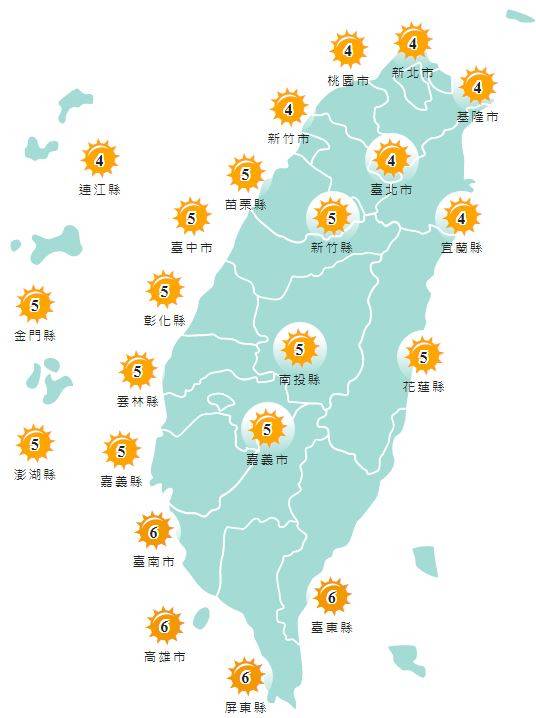 紫外線方面,明天除了台南市、高雄市、屏東縣以及台東縣為橘色「高量級」,其他縣市皆為黃色「中量級」。