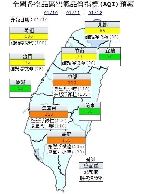 空品方面,明天宜蘭、花東空品區及澎湖地區為「良好」等級,北部、竹苗空品區及馬祖、金門地區為「普通」等級;中部、雲嘉南及高屏空品區為「橘色提醒」等級。