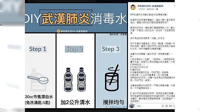 武漢肺炎疫情持續擴大,全球確診案例愈來愈多,台灣也掀起一波口罩、酒精搶購潮,日前就傳出有民眾感嘆,市售消毒產品及75%酒精1瓶難求。對此,兒科醫師徐嘉賢就在臉書上發文,分享如何在家DIY「武漢肺炎消毒水」,方法不僅簡單省錢,還不用跟別人搶貨,且這也是政府公布有效的方法。