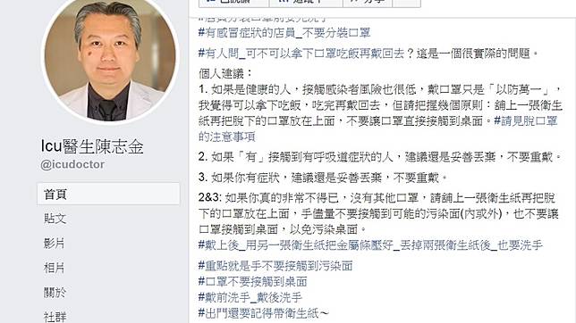 陳志金昨天(29日)在臉書上發文表示,有網友詢問他「可不可以拿下口罩吃飯再戴回去?」他個人提出3點建議,認為如果是健康的人,接觸感染者風險也很低,戴口罩只是「以防萬一」的話,「我覺得可以拿下吃飯,吃完再戴回去,但請把握幾個原則:舖(鋪)上一張衛生紙再把脫下的口罩放在上面,不要讓口罩直接接觸到桌面。」