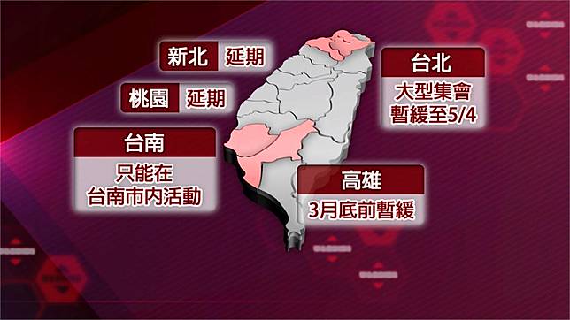 疫情拉警報,就怕畢業旅行、校外教學,增加群聚感染風險,台北市政府宣布,大型活動暫緩到5月4日,新北、桃園都延後,台中也延到5月,台南則限制只能在台南市內活動,高雄則延到4月之後。六都中就有五都確定延後,也讓飯店、餐廳、遊覽車叫苦連天。