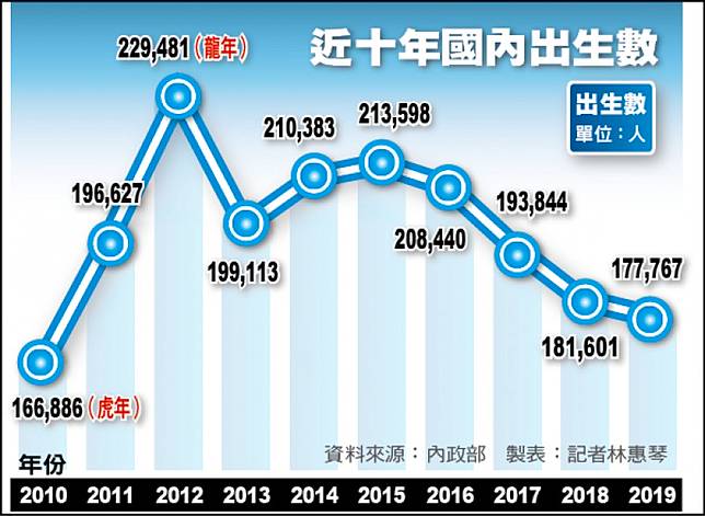 內政部統計,去年出生共十七萬七七六七人,回顧過去十年,僅高於二○一○年虎年的十六萬六八八六人。但去年新生兒較前年減約三千八百多人,減幅已較前兩年分別減一萬四千、一萬兩千多人出現趨緩,婦女新知基金會政策部主任覃玉蓉指出,影響原因很多,除政策鼓勵生育,可能也與國人較愛在象徵有福氣的龍年、去年的豬年生子有關。