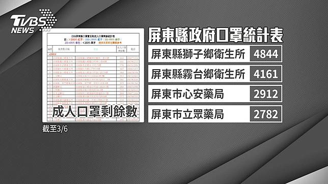 南台灣的屏東,跟台北藥局買口罩的景況,簡直是兩個世界,台北天天大排長龍,隊伍綿延好幾公尺長,屏東縣政府列出各藥局成人口罩庫存數,較偏遠的獅子鄉有將近5千個,霧台鄉有4千1百多個,甚至市區的藥局,也都超過2千片,兒童口罩庫存更驚人,有60間藥局都超過2千片。
